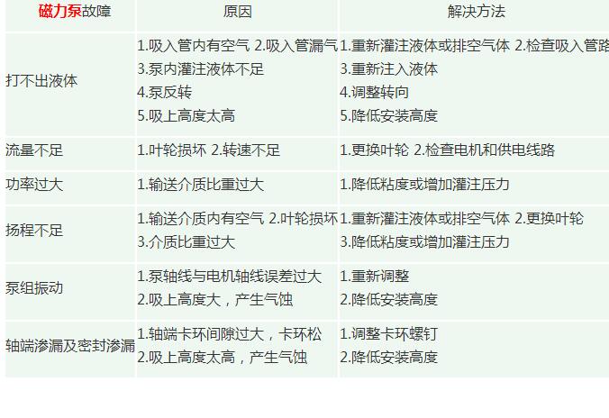 磁力泵組成及常見問題方案 2017年6月18日 4676人次 磁力泵由泵、磁力傳動器、電動機三部分組成。關鍵部件磁力傳動器由外磁轉子、內磁轉子及不導磁的隔離套組成。 當電動機帶動外磁轉子旋轉時,磁場能穿透空氣隙和非磁性物質,帶動與葉輪相連的內磁轉子作同步旋轉,實現動力的無接觸傳遞,將動密封轉化為靜密封。由于泵軸、內磁轉子被泵體、隔離套完全封閉,從而徹底解決了“跑、冒、滴、漏”問題,消除了煉油化工行業易燃、易爆、有毒、有害介質通過泵密封泄漏的安全隱患。 磁力泵六大常見問題及解決方案: